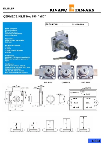 KİLİTLER KIVANÇ TAM-AKS ÇEKMECE KİLİT No: 850 "MIC" ÜRÜN KODU : S.14.00.000 4.004
