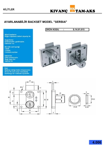 KİLİTLER KIVANÇ TAM-AKS AYARLANABİLİR BACKSET MODEL "SERBIA" ÜRÜN KODU : S.14.01.015 4.006