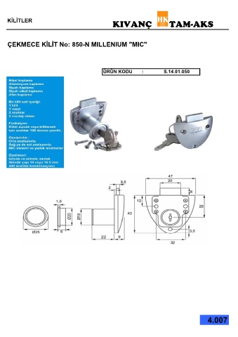 KİLİTLER KIVANÇ TAM-AKS ÇEKMECE KİLİT No: 850-N MILLENIUM "MIC" ÜRÜN KODU : S.14.01.050 4.007