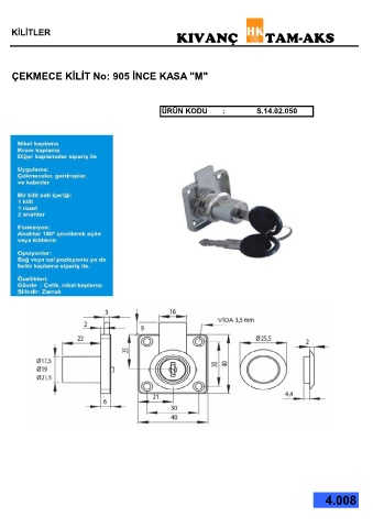KİLİTLER KIVANÇ TAM-AKS ÇEKMECE KİLİT No: 905 İNCE KASA "M" ÜRÜN KODU : S.14.02.050 4.008