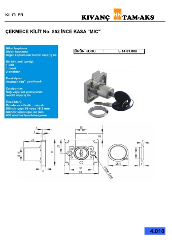 KİLİTLER KIVANÇ TAM-AKS ÇEKMECE KİLİT No: 852 İNCE KASA "MIC" ÜRÜN KODU : S.14.01.000 4.010