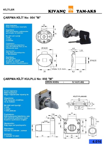 KİLİTLER KIVANÇ TAM-AKS ÇARPMA KİLİT No: 954 "M" ÇARPMA KİLİT KULPLU No: 856 "M" ÜRÜN KODU : S.14.01.482 4.016