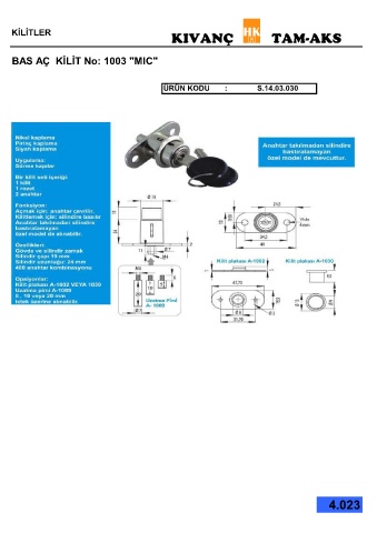 KİLİTLER KIVANÇ TAM-AKS BAS AÇ KİLİT No: 1003 "MIC" ÜRÜN KODU : S.14.03.030 4.023