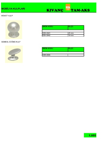 MOBİLYA KULPLARI KIVANÇ TAM-AKS MİSKET KULP ÜRÜN KODU ÖLÇÜ ÖZK.6041 25 mm ÖZK.6042 19 mm SEMBOL DÜĞME KULP ÜRÜN KODU ÖLÇÜ ÖZK.6045 1.055