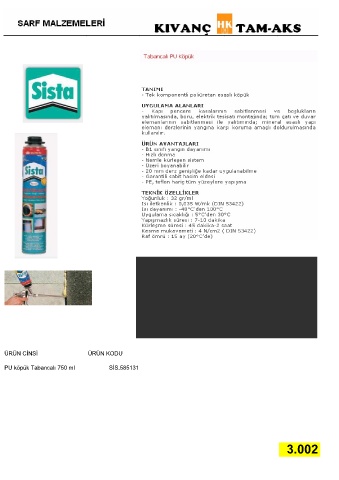 ÜRÜN CİNSİ ÜRÜN KODU PU köpük Tabancalı 750 ml SİS.585131 3.002